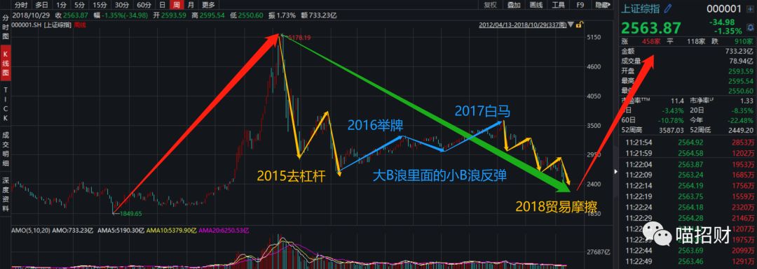 B浪b反弹始于2016年的“熔断底”(下图蓝色路径),造就了一批举牌帝一战成名,伴随着险资的入市和股权争夺,市场信心有所恢复。但遗憾的是,举牌行情在“妖精、害人精”的论断后,偃旗息鼓。直到2017年机构抱团蓝筹股,开启了上证50一轮波澜壮阔的行情。今年年初贸易摩擦的争端开始,宣告完结。期间浪型上的运行方式也有其对称性:2016年上涨10个月,之后调整6个月,2017年以白马股行情开启10个月的小c浪反弹。路径上仍然以三段式节奏运行。