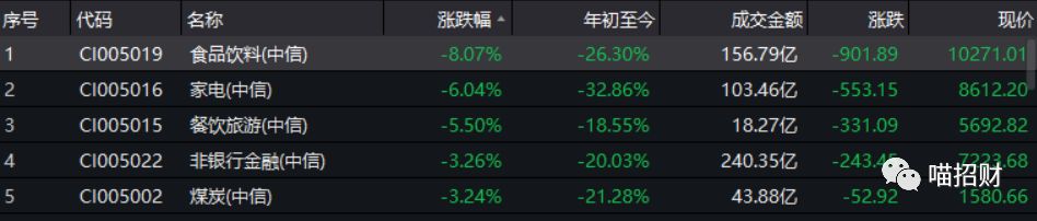 市场早盘集合竞价便呈现弱势特征,受到三季报不及预期的影响,茅台一字跌停。美的整合小天鹅,复牌亦大幅低开近9%。食品饮料中信一级行业显示,板块跌幅接近8%。白酒、家电、调味品等大消费成为调整的重灾区。