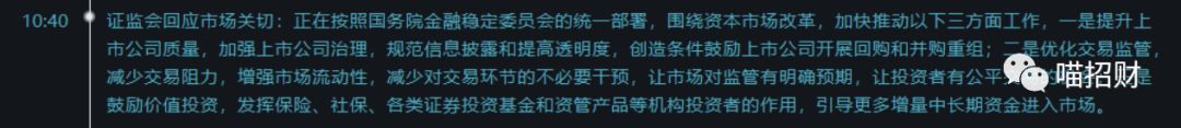 直到10:40证监会突然发声,罕见的对市场透露了政策上重大变化。主要三点:1.减少交易阻力、减少不必要的干预;2.鼓励回购和并购重组;3.鼓励长期价值投资资金的入场。这几句话的分量很大,指数在券商股的带动下瞬间拉升。