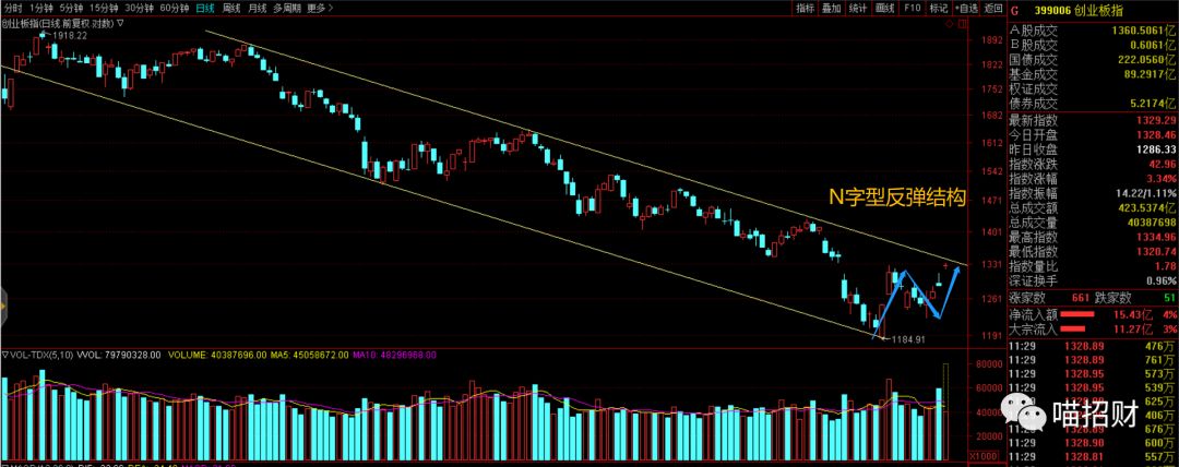 从早盘盘口的走势能够看出资金的忌惮。昨天的冲高回落还历历在目,今天大幅高开3%左右,资金也担心再次吃面。所以上午的盘面显示,创业板指在面临压力位的位置,横盘观望,围而不攻。直到中午一则消息出现,午后权重股集体发力,周末复盘预期的N字第二笔上涨已经非常清晰可见。