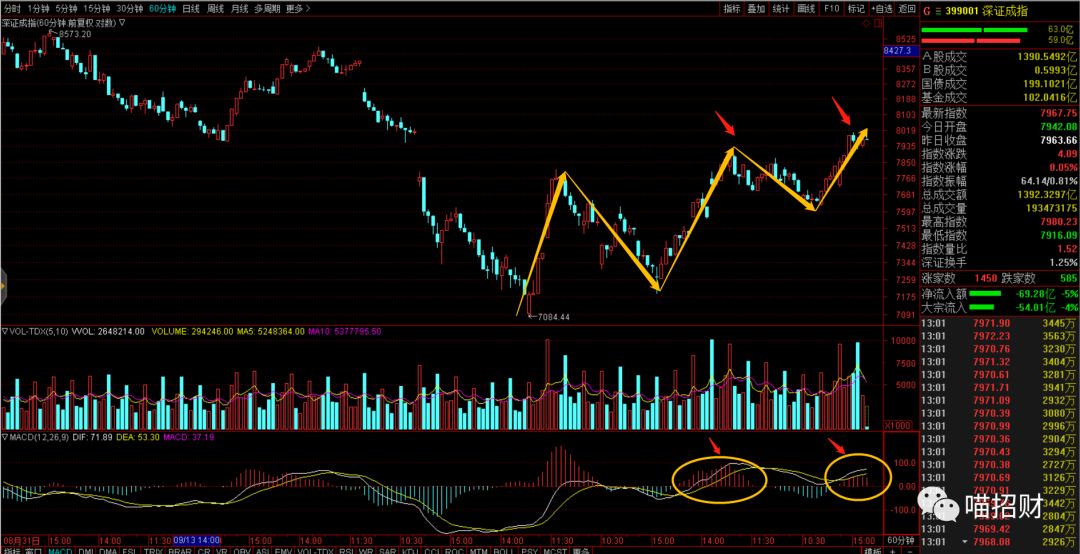 用深成指来分析(深成指比上证指数强,比创业板指弱,恰好综合反映市场平均情况),日线上能够看出一波5浪的走势,次级别出现了顶背离,MACD的指标呈现三波红柱子逐级缩小的趋势。这是最近要注意的信号。