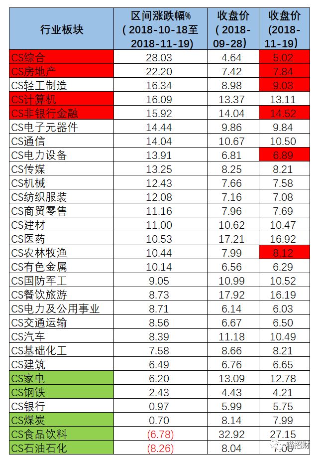 从10月18日的反弹至11月19日的行业涨跌分布看,行业板块间的差异化是非常明显的。涨幅靠前的是金融地产,其中创投和证券是细分板块的龙头。严格意义上计算机涨幅靠前,很大程度上也是同花顺、东财等互联网金融的带动,本质也是券商。所以第一梯队被这些占领。特点是:最核心受益于政策,且超跌或筹码稳定提前市场见底。