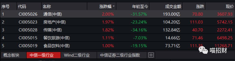 今天市场涨幅靠前的主要是通信、传媒和地产。概念板块主要有深圳本地股和黄金概念股。