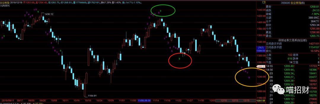 以创业板为对象来看,由于本轮上升和调整都是提前于其他指数,所以这里可以先关注创业板指的调整是否接近尾声。从低点的反弹开始,120分钟线比较清楚的记录了两次震荡序列的高低位,而明天早盘如果指数继续下跌,序列也将运行到低位指示(德马克指标的适用性是连贯的上升或下降,否则序列会破坏,无法形成结构)。
