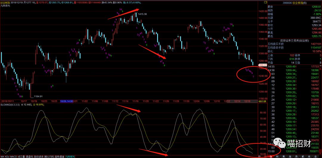 如果再用60分钟线去观察细微的变化,今天收盘是7的序列,如果下跌是连贯的,则有可能在明天的第二个小时出现低位指示。配合skd等震荡指标的极致情况和背离分析,可以加强观察的有效性。但这里需要注意的是,由于今天跌速是比较快的,同时指标指示仅仅是提供一个节点的参考,低位指示不代表随后就一定有上涨周期,即使有上升周期,也可能是弱势横盘代替,这些都是辅助观察的一些信号而已。