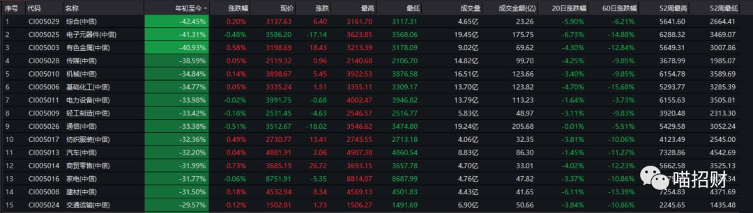 纵观一年跌幅排名,行业惨状历历在目,跌幅超过30%的有14个一级行业,没有一个行业在今年取得正收益。