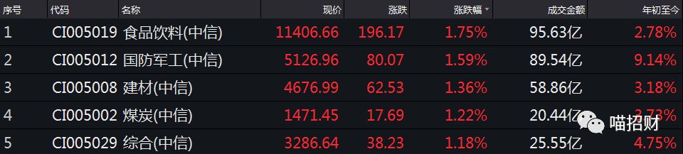 今天中信一级行业板块全数上涨,食品饮料、军工、建材涨幅居前。