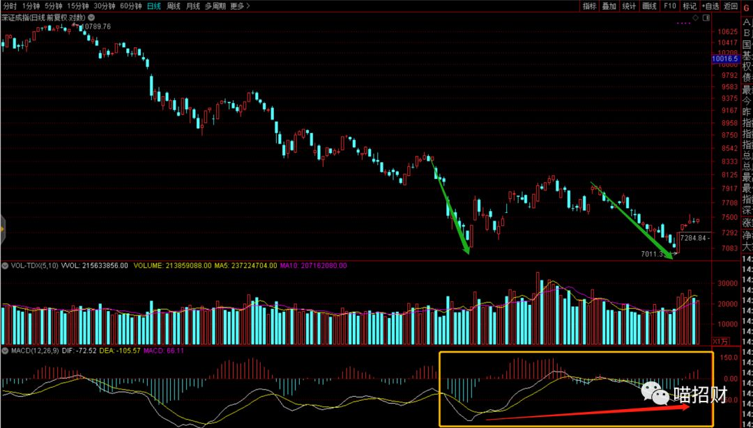 日线层面,通过两段下跌的速率比较,可以比较清楚地看到降速。小组对速率的解释,是价格对成交量敏感度的反应。月初喊2500以下思考如何买的问题,也有技术面背离的理论基础作支撑。所谓“刹车带”般的形容,即时长期资金与短期资金情绪的交换。