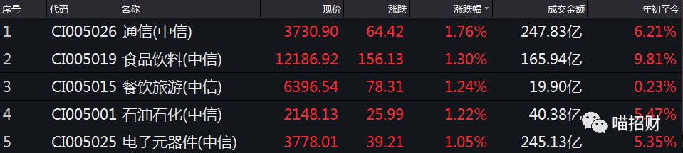 今天盘面普涨,通信、食品饮料两个机构重仓板块涨幅居前。