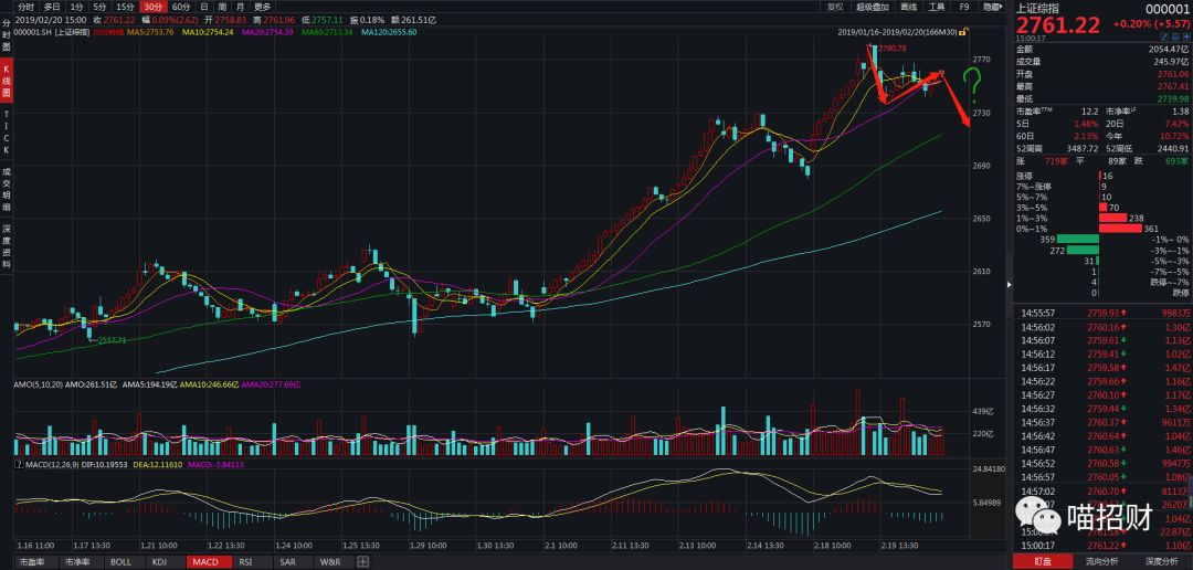 从波浪理论上讲,当前上证指数在30分钟级别上走调整浪,但从调整的时间角度上看似乎还是差了点意思,标准走势是再次向下走出30分钟C浪,但强势的市场可能并不会给空头太多的机会,复杂4浪的判断也是波浪理论中最难判断的一浪。