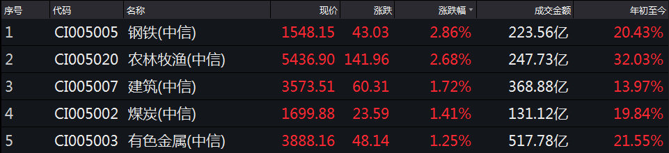 钢铁、农林牧渔、建筑涨幅居前,金融、家电、通信领跌。