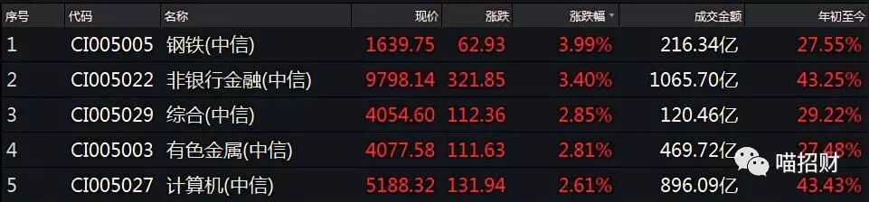 钢铁、非银涨幅居前,食品饮料略跌。