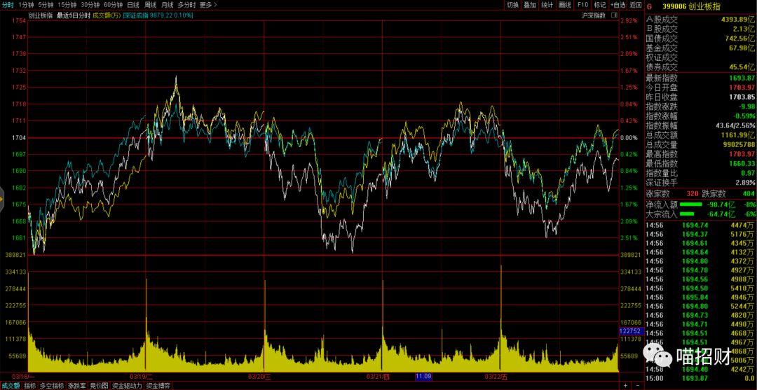 指数继续心电图走势,本周指数层面几乎没有太大变化。下图是创业板指最近5日的分时图,可以看出基本上1、2天形成一个高低点,这正是前期判断的中枢震荡的标准走势。