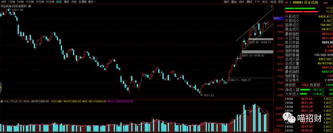 大周期的角度,小组在之前已经画出了上升旗型的通道线,目前指数基本围绕这个区间做高位震荡,深成指随着今天的收盘,周线完成11连阳的壮举。沪深主板的阶段走势更强,距离前期高点一步之遥,而创业板指略逊,背后是管理层对妖股和肆意炒作的监管压抑。