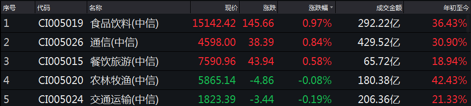 食品饮料、通信板块领涨,综合、传媒板块领跌。