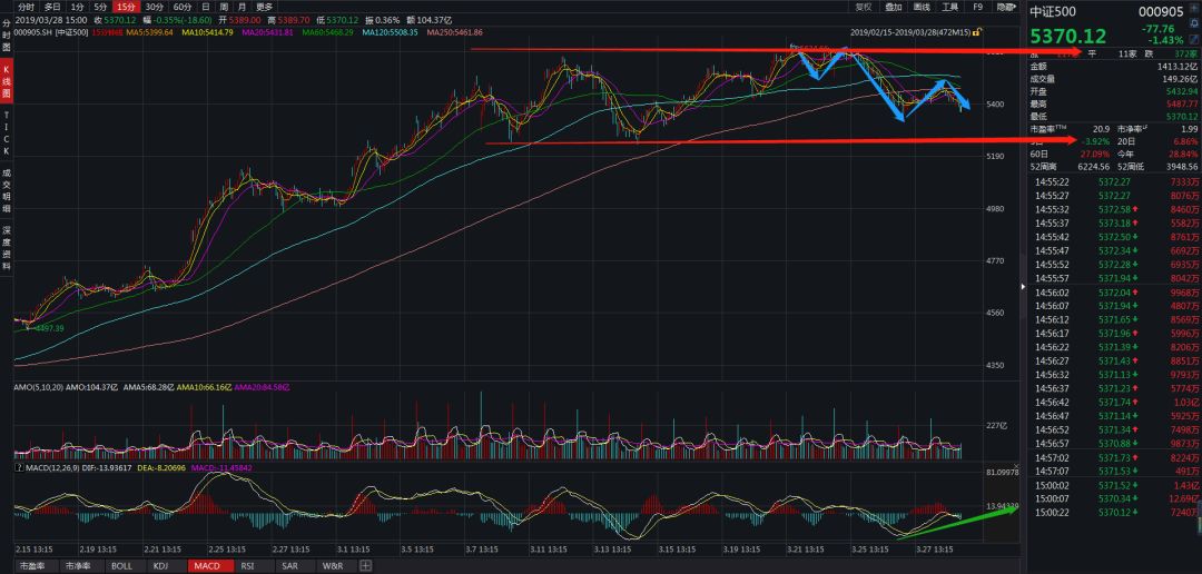 短期来看我们也需要留心,以中证500为例,15分钟级别已经进入了5浪走势,指数也走到了箱体的下沿,若创新低macd背离成立,短期有可能调整见底反弹。