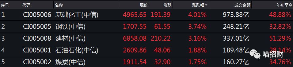 除了化工板块以外,以钢铁、建材、煤炭为代表的周期股今天领涨市场。随着经济的好转,周期复苏成为了市场的预期,其实不少工程机械的个股已经走出了翻倍的行情。当前市场的风格从科技转向周期,到底是风格切换还是补涨,这里我们需要继续作深入的考虑。