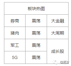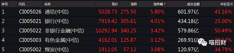 早盘有色板块领涨,随后5G板块10:30左右集体上攻,11点后银行保险又接过大旗继续高举高打,全天单边上扬。