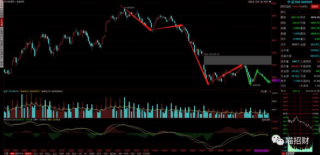 指数继续弱势寻底,沪指在2838连续两次收下影线,均未回补缺口,成为掣肘市场的心魔。目前来看指数继续运行在A5中,5月21日认为B浪反弹已经开始的判断有失偏颇,市场在负面因素持续发酵的背景下惯性下跌,关注明后天缺口处能否做出刹车带结构。