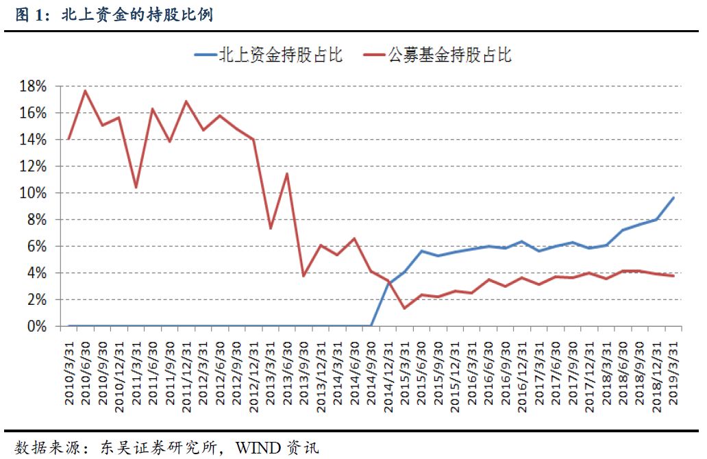 从茅台的持股比例上来看,北上资金持股占比在一路攀升,并且在14年底超过公募基金,成为最重要的买入力量。截至2019年一季度末,北上资金的持股数已经约占贵州茅台流通股本的10%了。