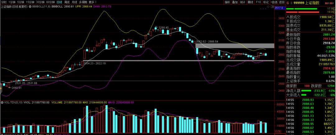 今天市场震荡走低,情绪再次降低到冰点。几大指数均跌破了昨天提到的三条均线支撑,短期面临考验前期低点的压力。昨天用以监测市场强度的多空布林线也在连续站稳三天后,再次跌破中轨。