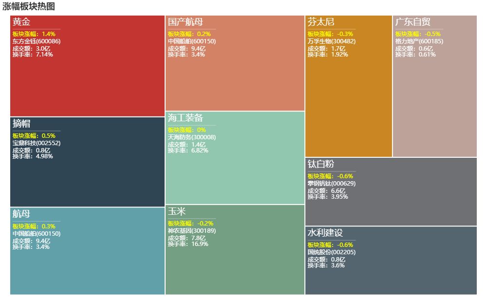 今日只有黄金板块在金价新高的带动下出现上涨,由于美元近期持续弱势,美股高位震荡,降息预期以及避险情绪推动金价创出一年多来新高,后续黄金股走势还需多看金价脸色。