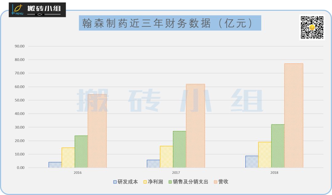 财务上,这两年翰森的营收和净利润增长都比较不错。2018年营收77个亿,毛利率超过92%,净利润19亿,花了30亿在销售上。公司过去三年的成长性尚可,研发支出也不算手软,销售费用占比高,但在行业里面也算可以理解。