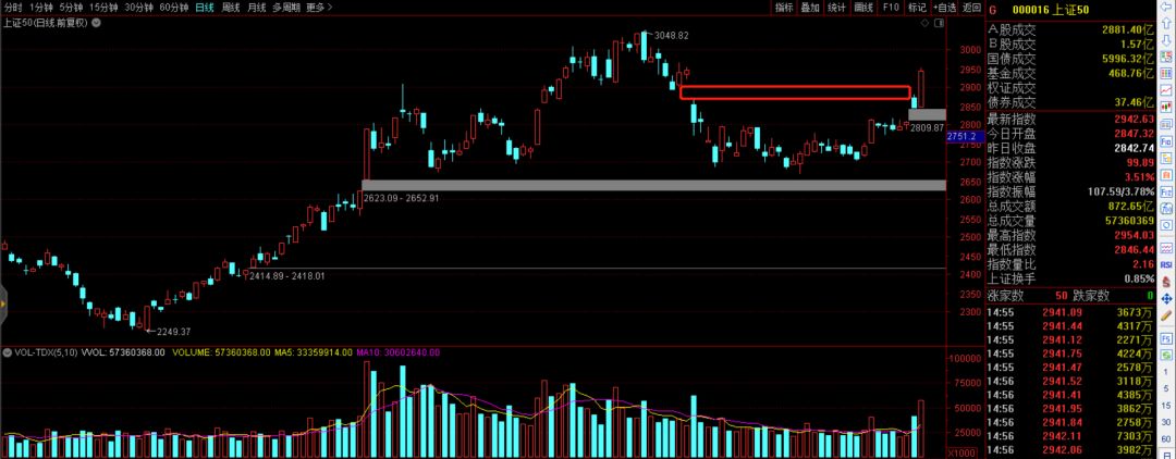 今天两市出现反弹,市场情绪瞬间很亢奋。特别是昨天高开低走的阴影下,出现反包,在技术走势上属于强势的范畴。上证50率先弥补了上面的缺口,给予市场定心丸。不但回补缺口,而且回到了前高的平台位置,超额完成任务。