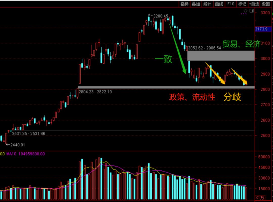 我们很早就说过市场的两个缺口,上面代表了贸易和经济,下面则是政策和流动性,评估市场的力量主要就看双方正负面因子的变化,任何的因子变动都会导致市场抉择方向。就像拔河比赛的过程,把四因子当做一个简单的模型,因势利导。