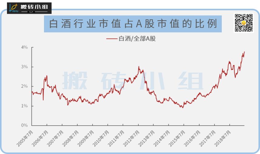 我们再来观察一下白酒行业的市值占全部A股市值的比例的变化,可以看到,从2015年开始,白酒行业就逐步摆脱了“塑化剂”、“限酒令”的影响,市值占比逐步上升,早已经突破之前两轮牛市的最高点。