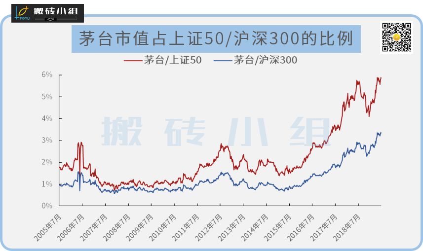 A股有两个常用的指数——上证50和沪深300,一般大家都认为这两个指数代表了“大盘股”、“蓝筹股”,我们可以观察一下茅台市值占这两个市值的比例。从中可以发现,茅台市值的占比不断提高,早已远高于牛市的最高水平。