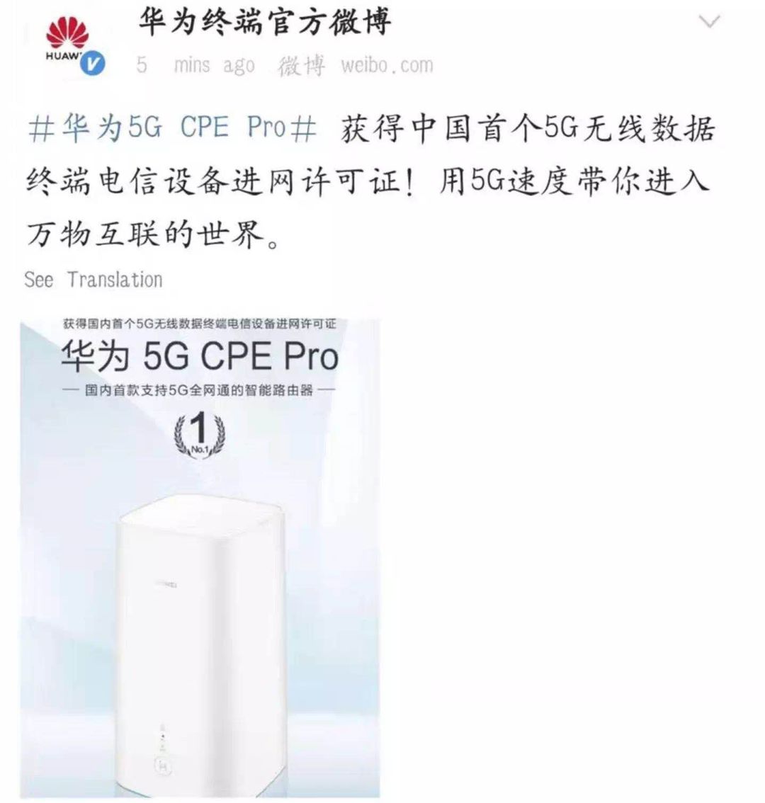 【华为5G CPE Pro获得中国首个5G无线数据终端电信设备进网许可证】