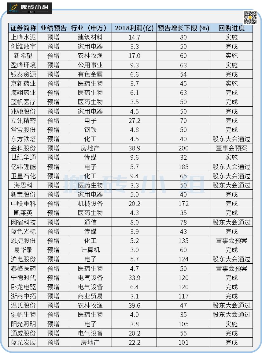 为了剔除这种伪增长的公司,我们选择2018年净利润基数大于3亿、业绩预增30%、实施过或正在实施回购的公司整理了一下,并手动剔除了部分公司。为什么关注回购,因为这是一个比较重要的筛选条件,上市公司愿意主动回购的,要么是有市值管理的诉求,要么是觉得价值确实被低估,对于股价表现的正面推动是很明显的。所以我们在真实增长中优选了以下公司,供大家参考。