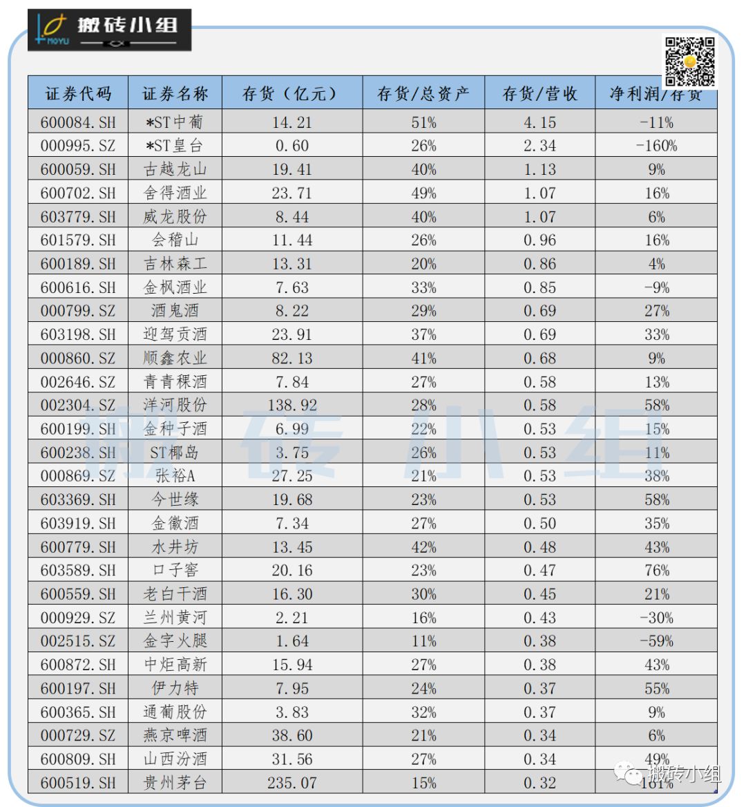 小组另外关注的一个维度是净利润占存货的比值,这个数值很重要!尤其是上市公司的存货跌价准备计提的不够积极的时候,这个比率直接反映了利润的安全垫。想象一下,100块钱存货,1块钱利润,存货波动1%,计提1%的跌价准备,利润就亏没了。。。所以要关注净利润/存货的值比较小的公司,存货一旦减值,当期净利润受到的影响就很大,往下突突的力度可以想象。。