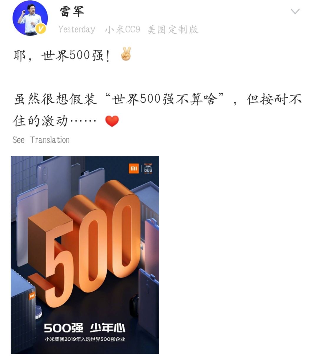 中国公司今年新上榜的企业一共有13家,占新上榜公司总数的一半以上。这13家公司的名字说出来大伙耳熟能详:格力电器、华夏保险、国家开发银行、安徽海螺集团、铜陵有色金属集团……等等。这里面最值得一提的就是小米了,小米本次排名468位,虽然排名要比格力电器靠后,但是小米成立只有9年,是2019年世界500强中最年轻的公司。小米的上榜也把雷军乐坏了,在微博上得瑟了一把。