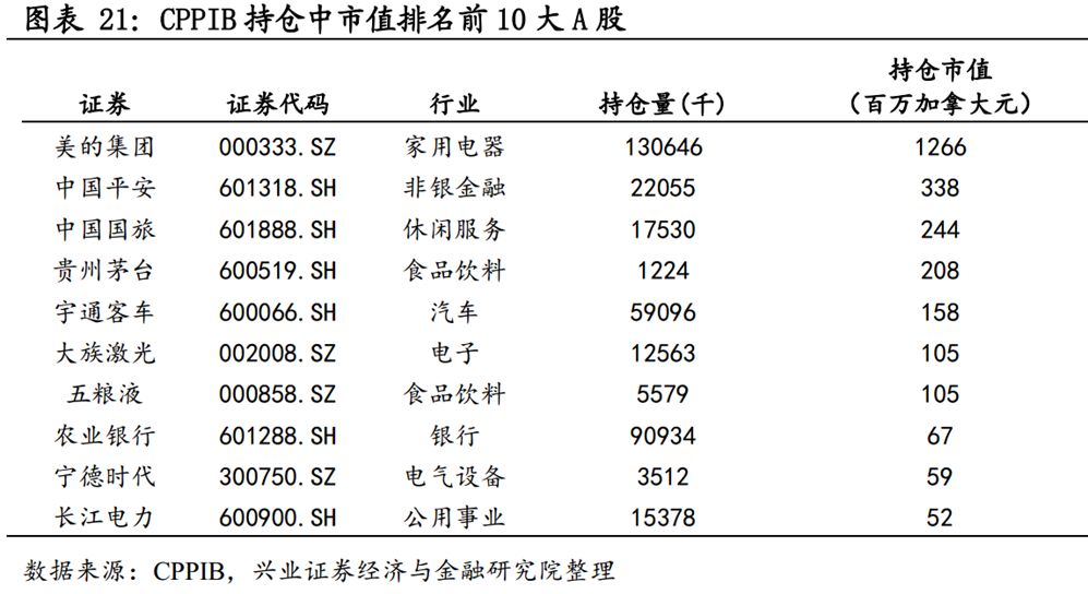 CPPIB看重新兴市场,也持有了大量的中国公司的股票,下面是持仓前十大A股的清单,小伙伴们可以直接抄加拿大养老金的作业,但是这个名单里的大族激光要注意,雷人不分海内外投资者。。。