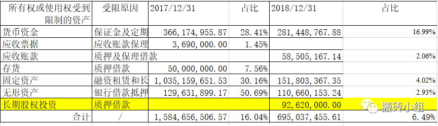 小姐姐梳理了公司公开披露的受限资产,也发现了一个奇怪的现象。比如“长期股权投资”披露有拿去做抵押借款,但是公司在2018年年报中并没有记载公司有长期股权投资这一项,这个资产是什么,挺让人费解的,明明被拿去借钱的东西,怎么就在报表上消失了呢。。