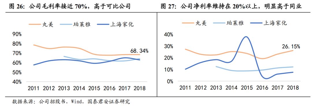 丸美股份主要从事化妆品的生产销售业务,产品包括眼部护肤品、肌肤清洁品、面膜、彩妆等。我们先来看看公司的产品毛利率,就知道这钱有多好赚。