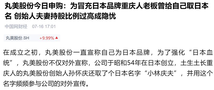 这个质疑还要从丸美成立时说起,IPO资料显示丸美的前身是2002年成立的广州佳禾,是广州升旺和日本史威成立的中外合资公司。在2008年时,《每日经济新闻》报道了丸美遭到职业打假人王海打假:丸美产品宣传的日本背景并不符实,丸美宣传中的创始人“小林庆夫”被证实是总经理孙怀庆的日本名字,而孙怀庆是中国人,“创始于昭和54年”等也涉嫌虚假宣传。