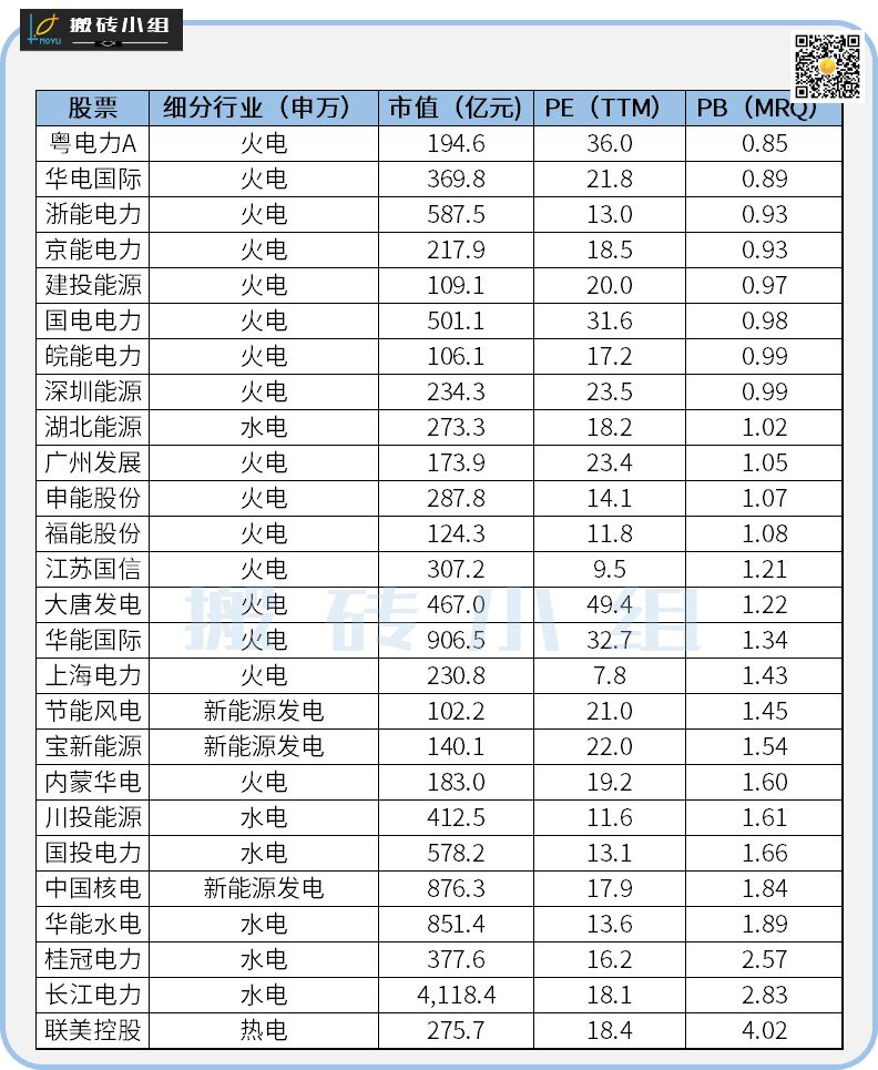 其实上面说的很多逻辑都是行业层面的逻辑,小组将电力行业的主要股票的估值拉了份清单,大伙可以关注一下电力行业与公司的变化。
