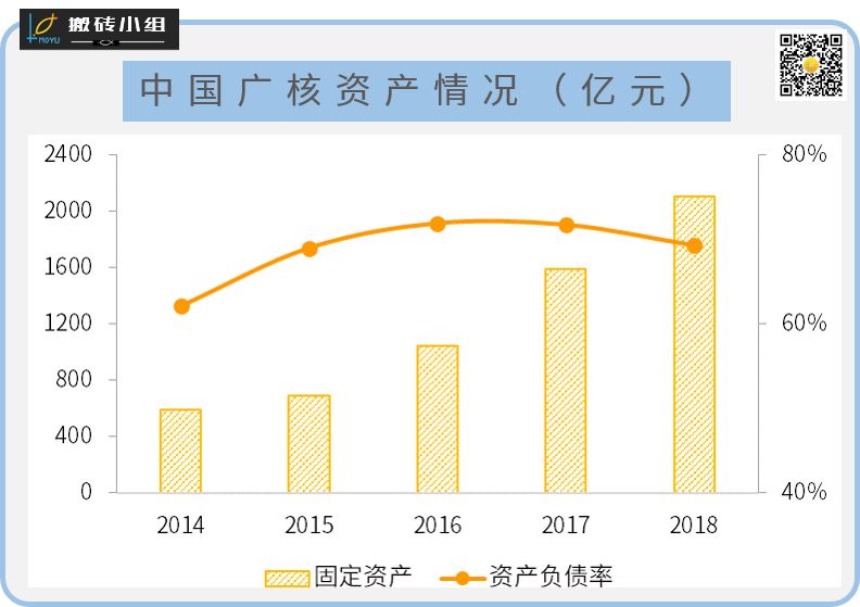 说到核电行业,大家一定会想到一些标签:重资产、高杠杆、稳定现金流,而中国广核的报表也完美的体现了这些特点。中国广核的固定资产从2014年的588亿上升到了2018年的2109亿,四年的时间增长了358%!而对应的资产负债率也维持在70%左右。随着资产的不断增长,公司的收入也从2014年的208.5亿上升到了2018年的508.3亿元。