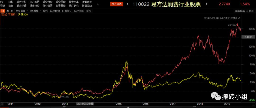 易方达消费的掌舵人是业内的明星基金经理萧楠,这也是萧老板接手的第一支基金。萧老板的投资风格十分鲜明,一点不辜负基金名字里的消费两个字,从10年开始就一直盯着白酒、家电这种大消费股猛干,持股的集中度巨高,泸州老窖一拿就是十年,看得小姐姐都愣了一愣。。