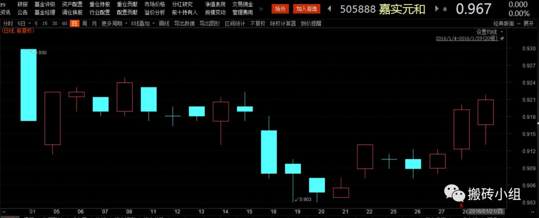 具体到嘉实元和这一只,印象真的很深刻。上市不久,就赶上熔断,一个几乎是纯现金的产品,跟着市场被砸了两个跌停板,简直就是送钱。小组也是在那个时候第一次关注到嘉实元和。后来元和的净值差价有所收敛,但还是在12-16%之间,小组就持续参与了很久。