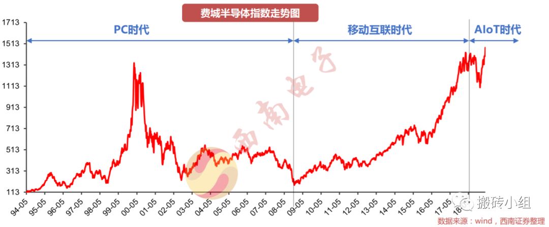 直到2017年开始,智能手机需求见顶,半导体指数在短暂下行后,又在5G的春风下创出了新高。对2017年之后的新时代,西南证券称之为AIoT时代。