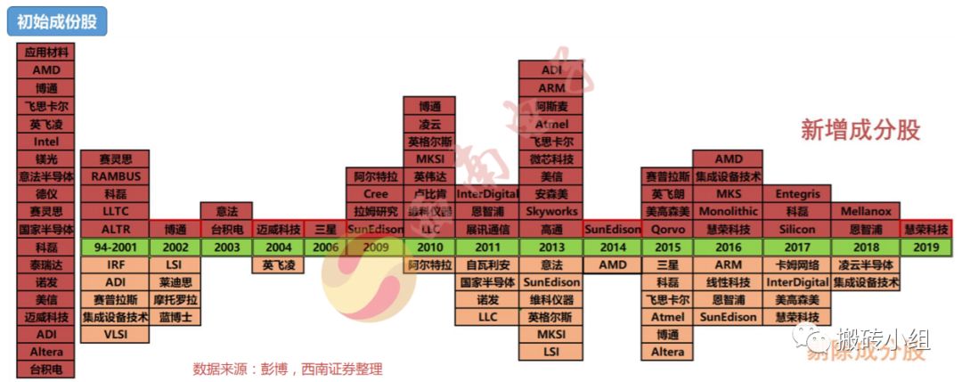 后来随着半导体行业的发展,费城半导体指数也在不断更新,记录下了整个半导体产业二十多年来的历史变迁。