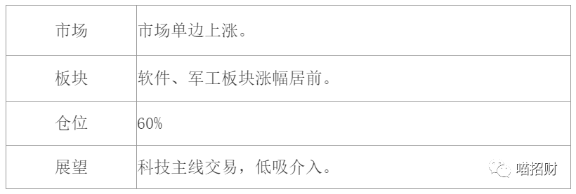 科技线资金开始转向炒作软件和自主可控,板块内十多家涨停,中国软件作为资金龙头已经走出趋势。硬件端的炒作有加速的迹象,在这轮加速后注意要进行对科技板块内的适当腾挪,高换低能适当降低净值的回撤风险。