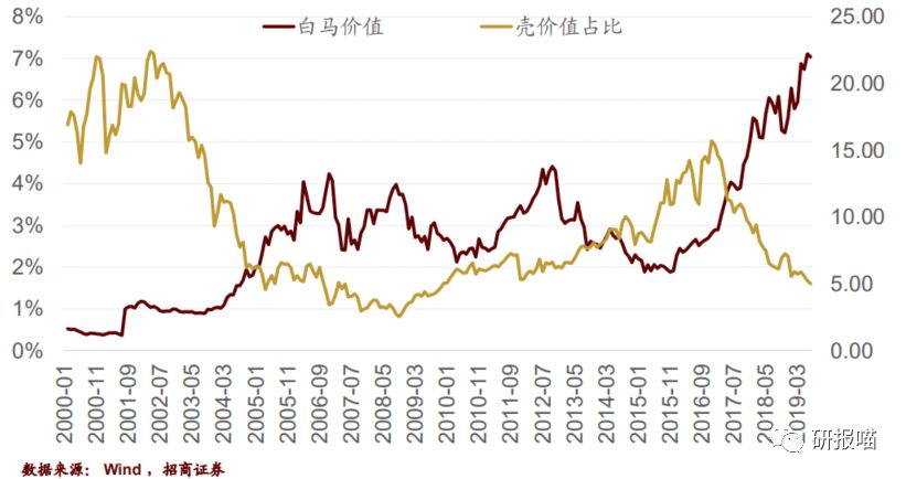 1、白马VS中小白马价值的凸显一般出现在系统性熊市,同时缺乏技术进步的大背景下。与中小盘,壳价值表现出现明显的镜像效应。