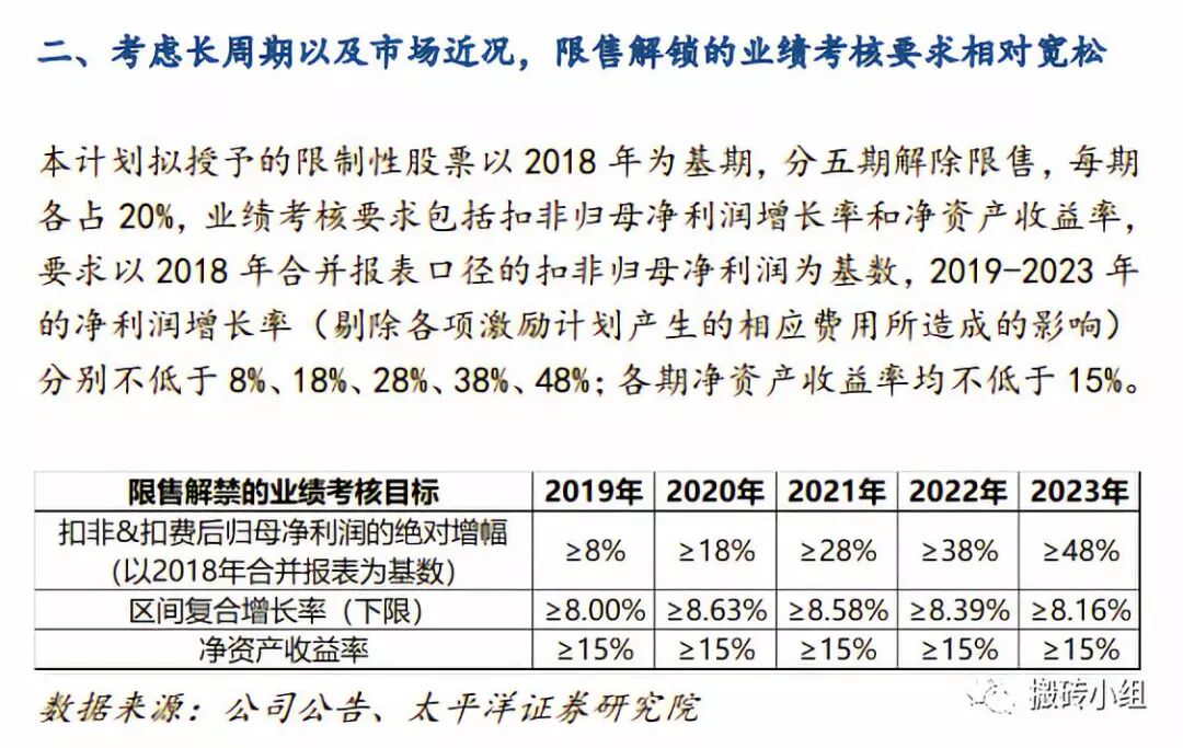 2、行权条件里对净资产收益率的要求从15%提高到20%。这是一个不低的标准了,小组之前拉过清单,大A3000多家公司,把时间放大到最近10年,能做到每年净资产收益率稳定在20%以上的,也只有那么11家,其中基本都是大伙熟悉的名字,比如茅台、海天、格力。