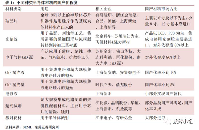 根据东莞证券的测算,国内大部分产品的自给率很低,基本不到30%,而且大部分是技术壁垒比较低的封装材料,晶圆制造材料对进口的依赖度仍然很高。