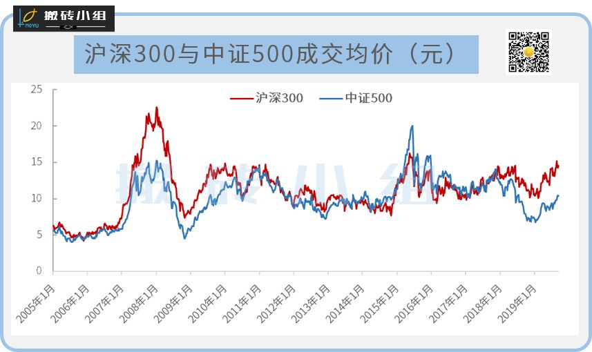 再来比较一下代表大盘股的沪深300和代表小盘股的中证500,可以发现,在2007年的牛市中,大盘股的成交均价要高于小盘股;而到了2015牛市顶点时,出现了相反的情况。从2017年开始白马行情到现在,大盘股的成交均价要明显高于小盘股,挤泡沫让小票纷纷挂了。